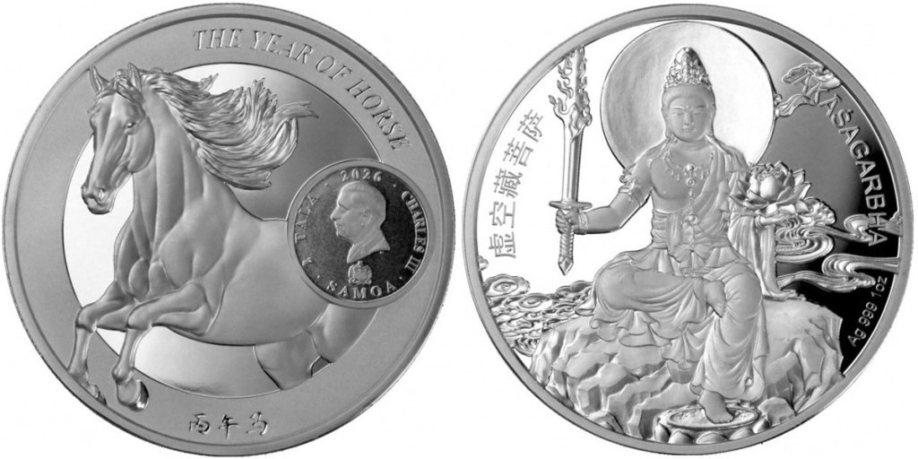 SAMOA 2 Tala 2026 – Year of the Horse : Akasagarbha – 1 oz 0.999 silver Proof – mintage 2,026 – diameter 40 mm – unknown price.