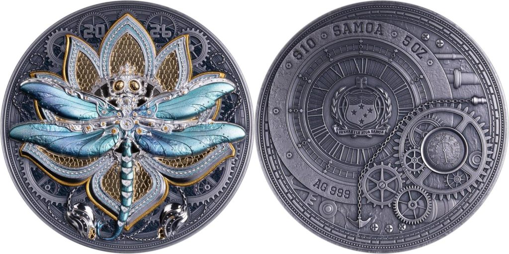 SAMOA 10 Dollars 2026 – Steambeasts : Dragonfly – 5 oz 0.999 silver antique finish – mintage 499 pcs only – diameter 65 mm – observed price $1,047.