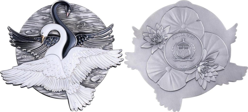 SAMOA 10 Dollars 2026 – Cygne blanc et noir – 500 g Argent 999 finition antique – 399 exemplaires seulement – taille 121,3 x 110 mm – prix observé 2599,95 euros.