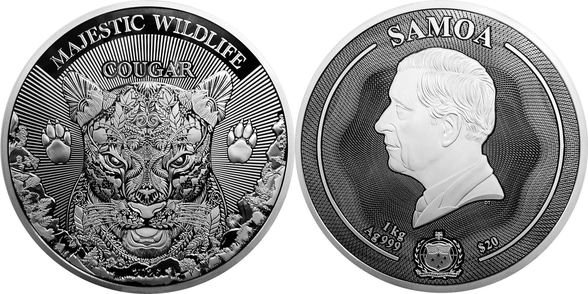 SAMOA 20 Dollars 2026 – Vie sauvage majestueuse : Cougar – 1 kg Argent 999 Proof-like – 199 exemplaires seulement – diamètre 180 mm – prix observé 3599,95 euros.