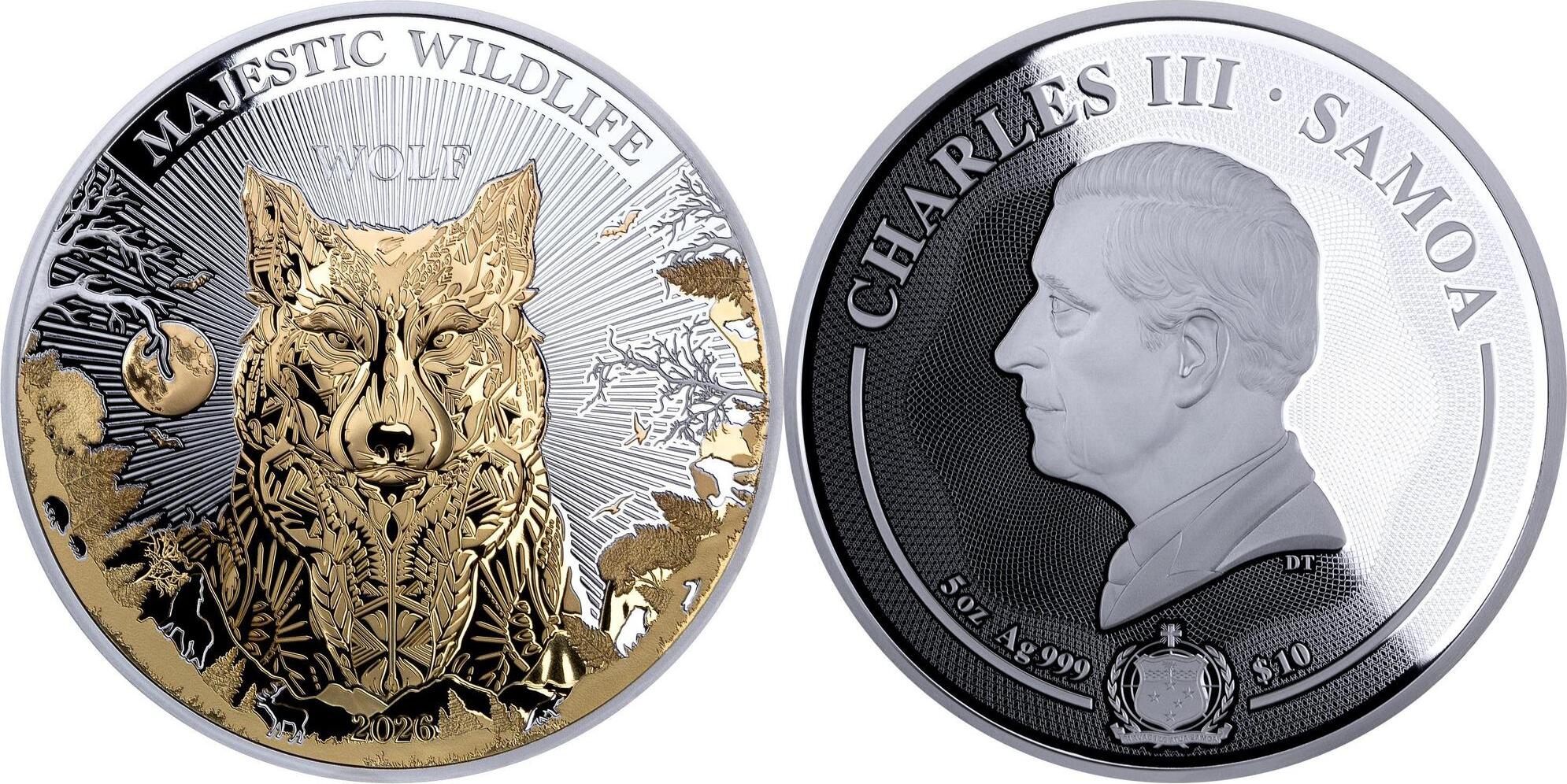 SAMOA 10 Dollars 2026 – Vie sauvage majestueuse : Loup – 155,5 g Argent 999 Proof-like (partiellement plaqué or) – 399 exemplaires seulement – diamètre 65 mm – prix observé 899,95 euros.