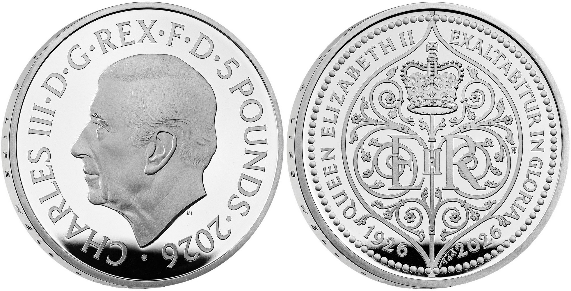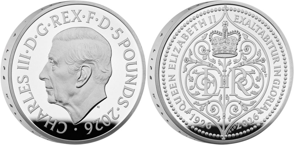 UNITED KINGDOM 5 Pounds 2026 – The 100th anniversary of Queen Elizabeth II – 56.56 g 0.925 silver Proof – mintage 250 sets only – diameter 38.61 mm – set price $1,069.