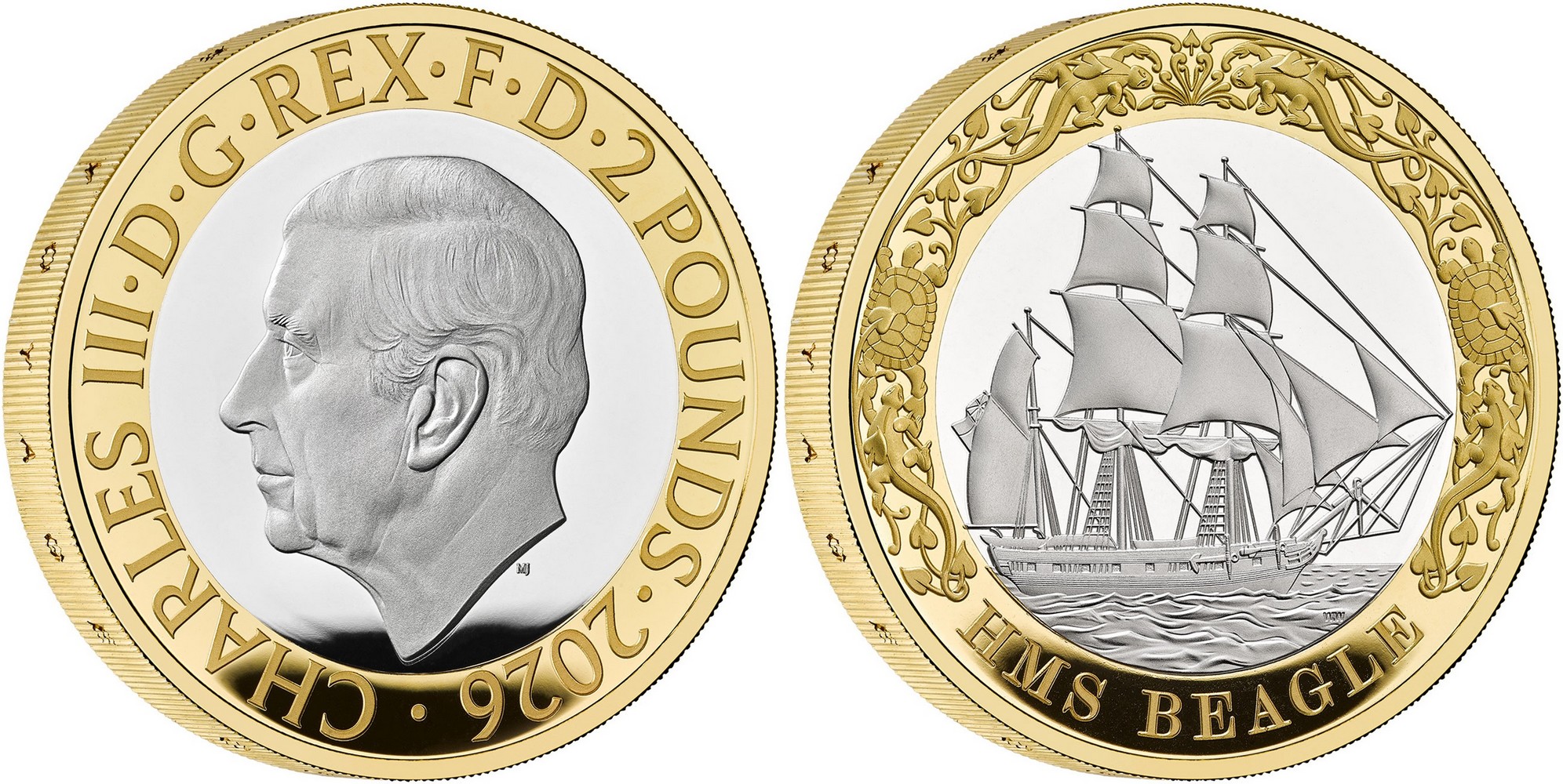 UNITED KINGDOM 2 Pounds 2026 – HMS Beagle – 24 g 0.925 silver Proof (gilded outer ring) – mintage 250 sets only – diameter 28.4 mm.
