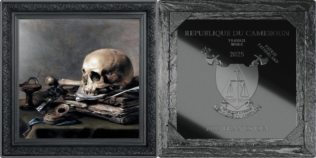 CAMEROON 1000 Francs CFA 2025 – Memento Mori by Pieter Claesz – 1 oz 0.999 silver black Proof – mintage 999 pcs – diameter 40 mm – observed price $174.50.
