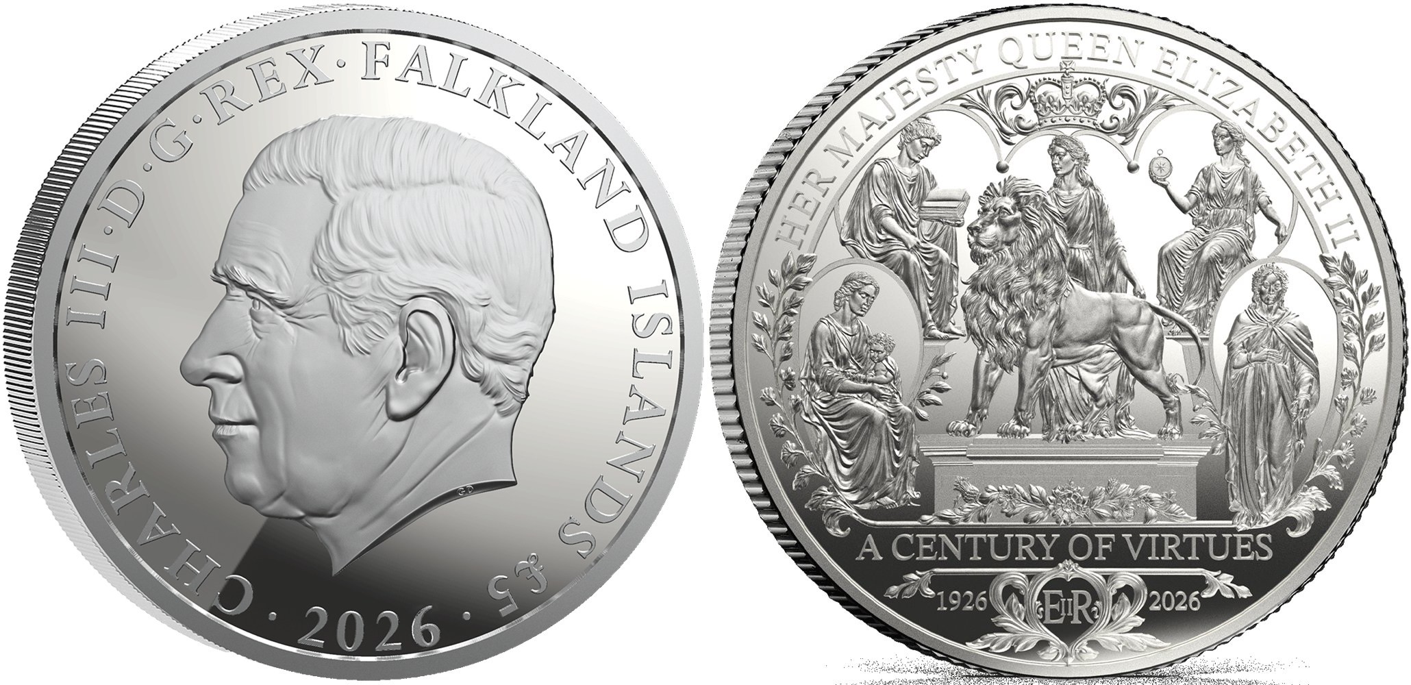 ILES FALKLAND 5 Pounds 2026 – Vertues de la Reine – 31,1 g Argent 999 Proof – 799 exemplaires – diamètre 38,6 mm – prix ignoré. Existe en version de 5 onces.