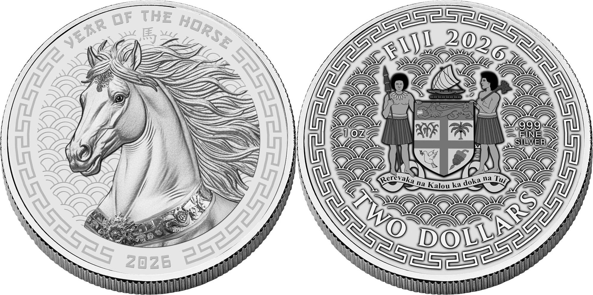 FIJI 2 Dollars 2026 – Year of the Horse – 1 oz 0.999 silver BU – mintage 888 pcs – diameter 38.61 mm – observed price $197.70.