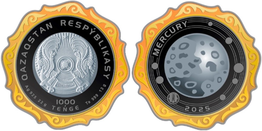 KAZAKHSTAN 1000 Tenge 2025 – Mercure – 35 g Argent 925 Proof (avec insert de tantale) – 1000 exemplaires – diamètre 38,61 mm – prix ignoré.