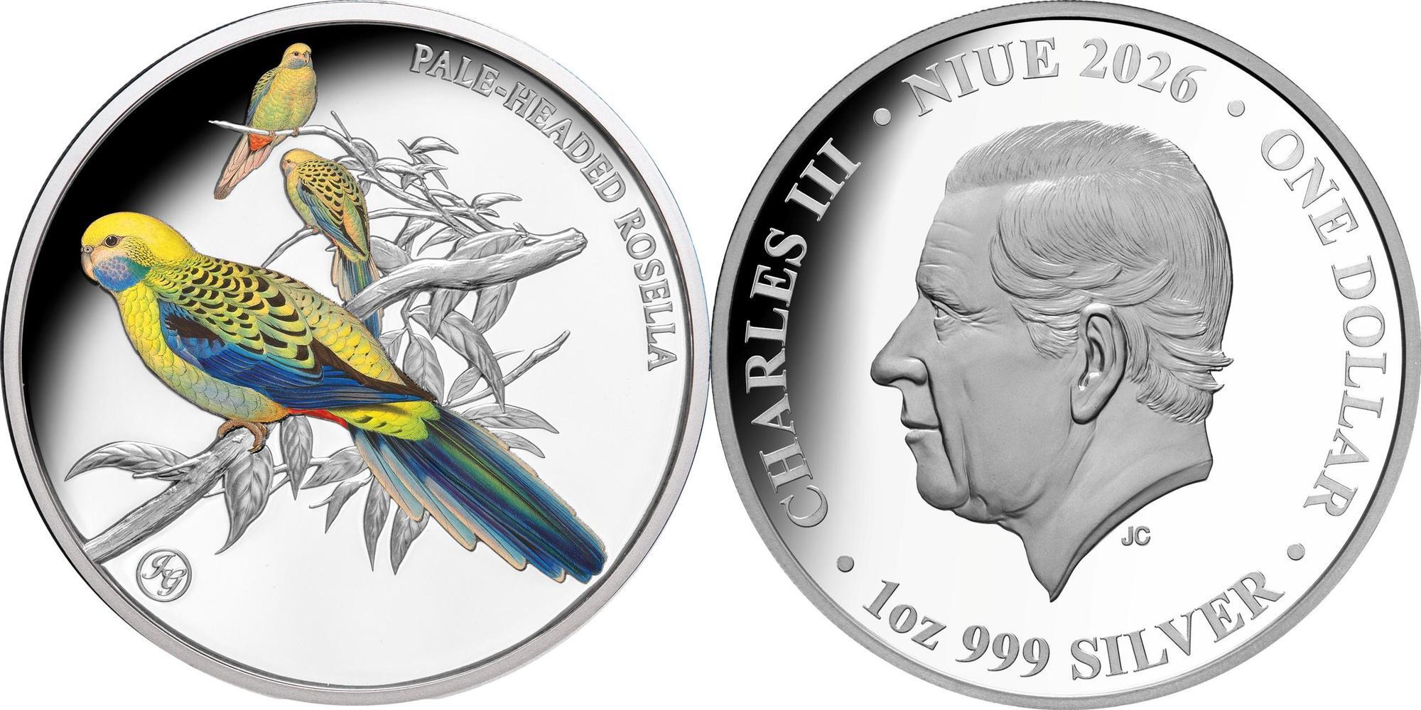 NIUE 1 Dollar 2026 – Pale Headed Rosella – 1 oz 0.999 silver Proof – mintage 750 pcs – diameter 40 mm – unknown price.