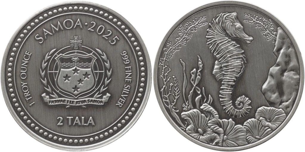 SAMOA 2 Tala 2025 – Seahorse – 1 oz 0.999 silver antique finish – mintage 1,000 – diameter 38.8 mm – unknown price.