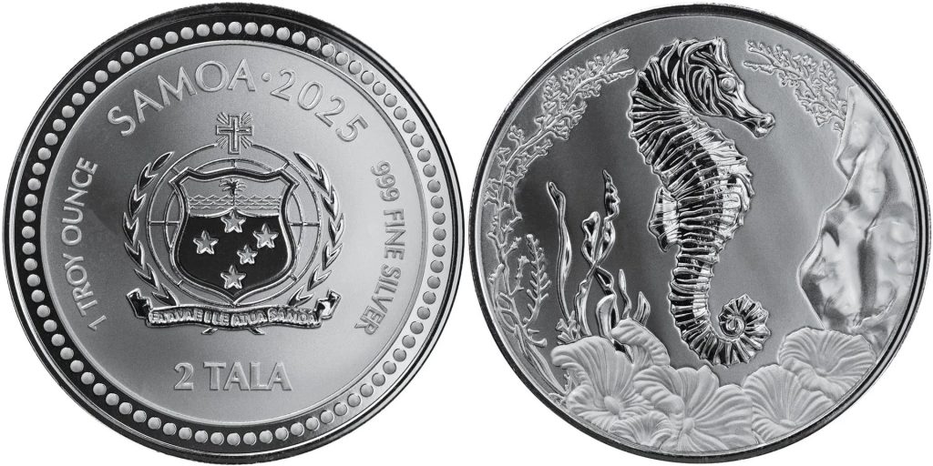 SAMOA 2 Tala 2025 – Seahorse – 1 oz 0.999 silver BU – mintage 10,000 – diameter 38.8 mm – unknown price.