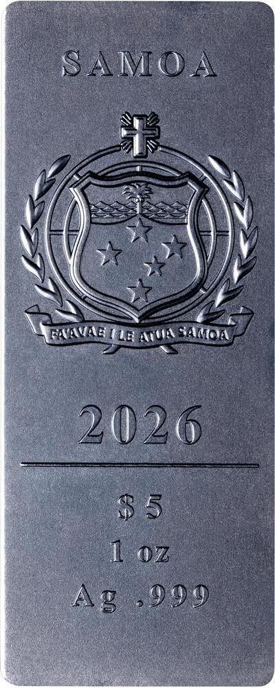 SAMOA 4 x 5 Dollars 2026 – Coupe du monde FIFA 2026 – 4 x 31,1 g Argent 999 finition antique – 500 exemplaires seulement – taille 22 x 55 mm – prix observé 479,95 euros.
