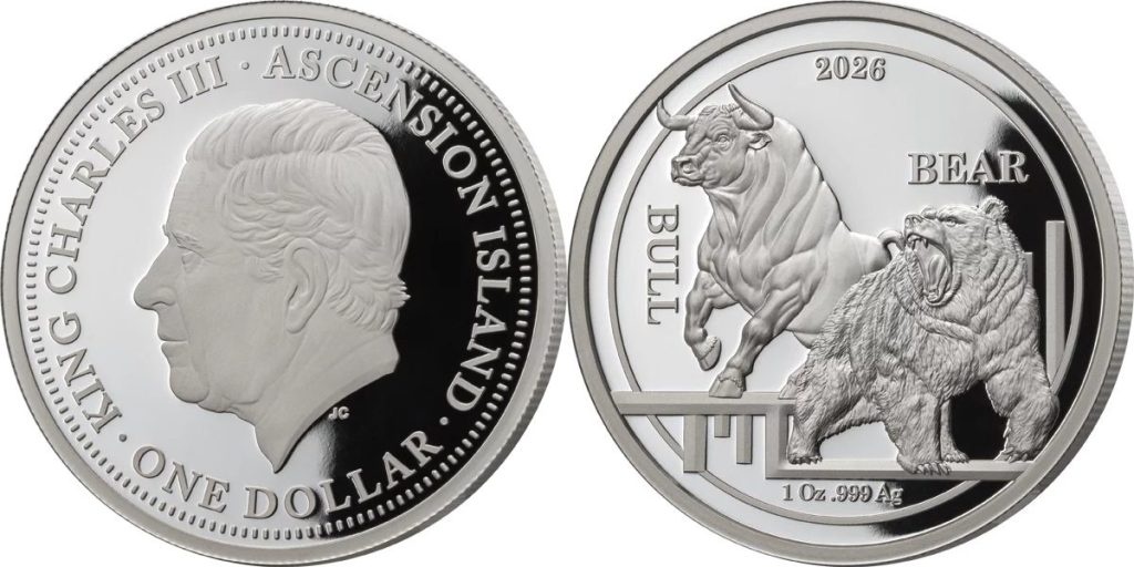 ASCENSION ISL 1 Dollar 2026 – Bull & Bear – 1 oz 0.999 silver Proof – mintage 1,000 – diameter 38.6 mm – unknown price.