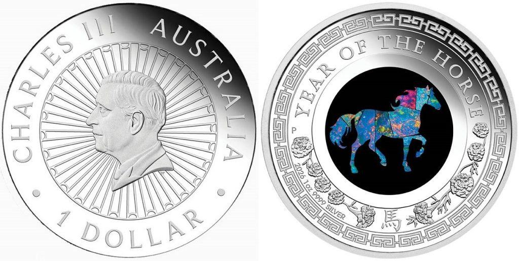 AUSTRALIA 1 Dollar 2026 – Year of the Horse – 1 oz 0.999 silver Proof (opal center) – mintage 6,000 – diameter 36.6 mm – price $191.20.