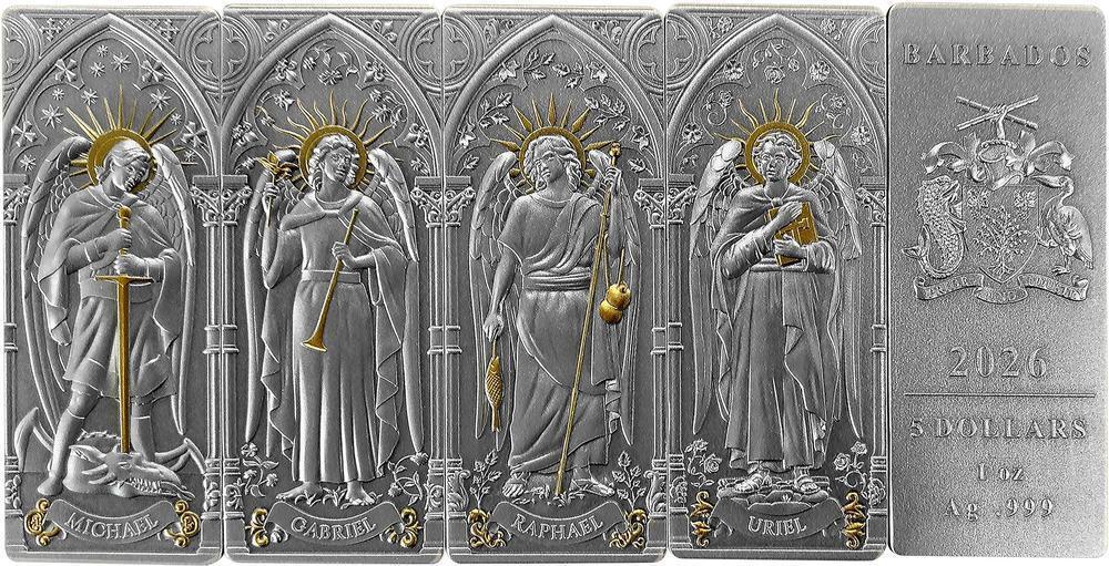 BARBADOS 4 x 5 Dollars 2026 – Archangels – 4 x 1 oz 0.999 silver antique finish – mintage 500 pcs only – size 22 x 55 mm – observed price $756.30.