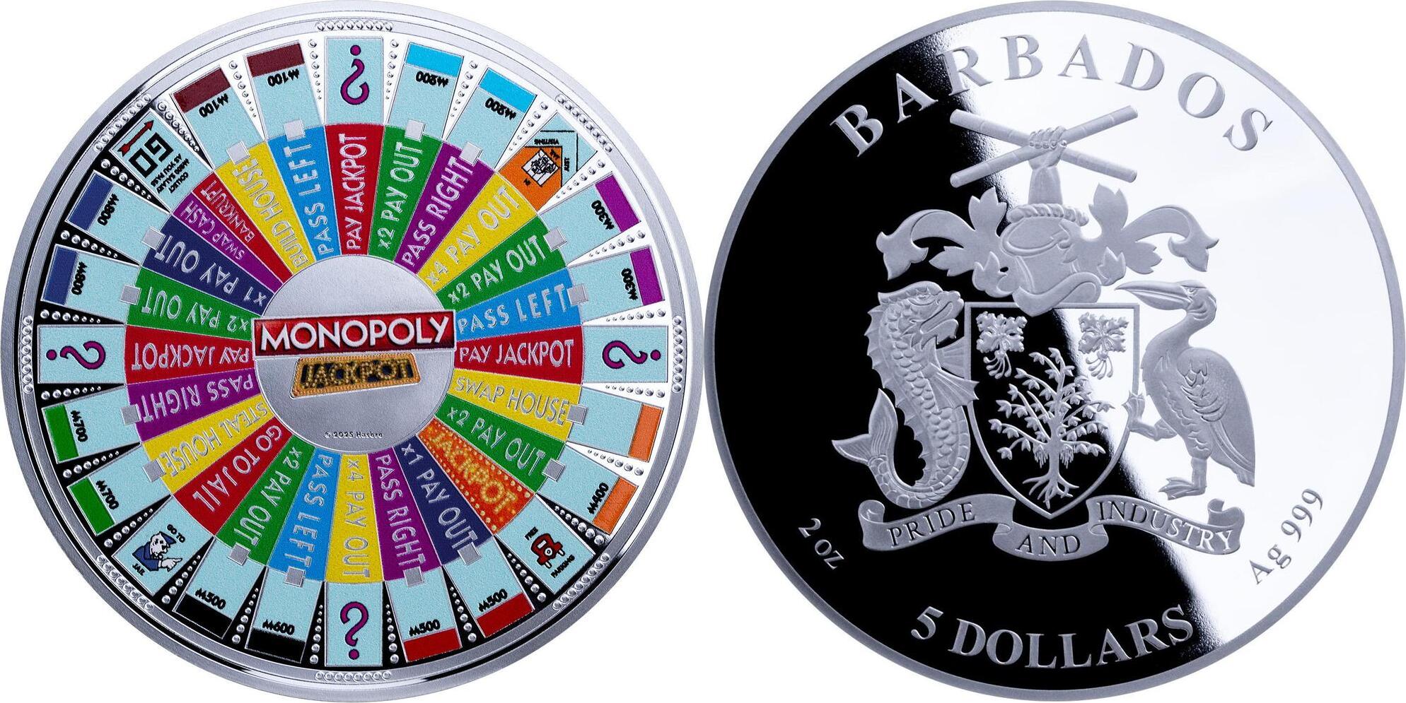 BARBADOS 5 Dollars 2026 – Monopoly – 2 oz 0.999 silver Proof-like – mintage 777 pcs – diameter 70 mm – observed price $407.20.