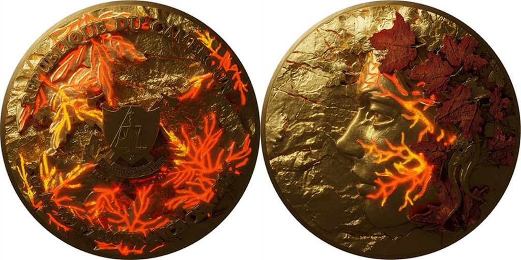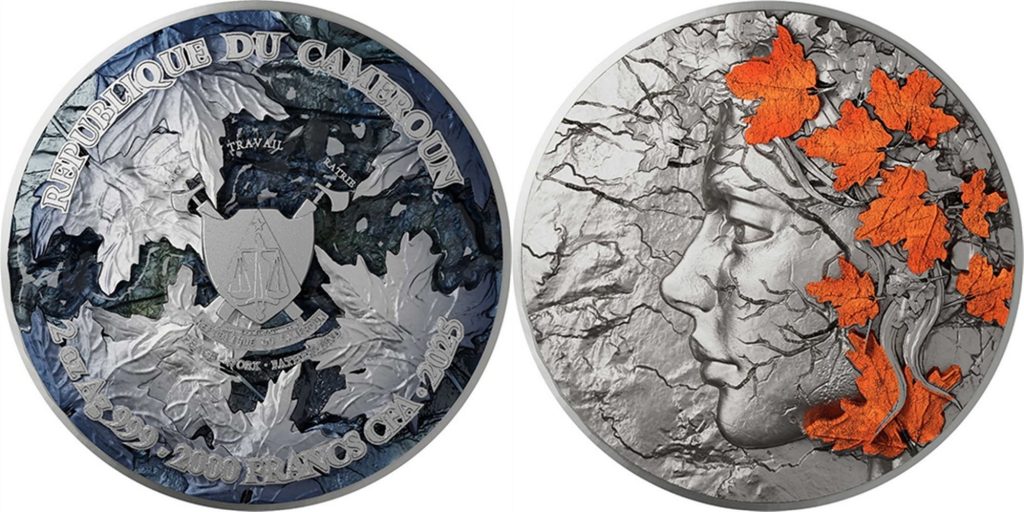CAMEROON 2000 Francs CFA 2025 – Whispers of the maple autumn – 2 oz 0.999 silver antique finish (high relief gilded with UV painting) + 1 kg 0.999 copper – mintage 199 pcs only – diameter 120 mm – unknown price.