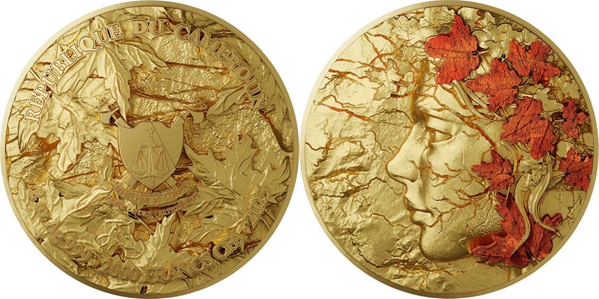 CAMEROUN 2000 Francs CFA 2025 – Murmures d’automne des érables – 62,2 g Argent 999 finition antique (haut relief plaqué or avec peinture UV) + 1 kg cuivre 999 – 199 exemplaires seulement – diamètre 120 mm – prix ignoré.