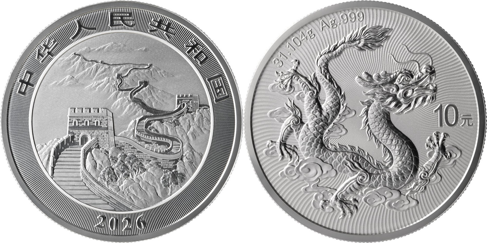 CHINA 10 Yuan 2026 – Chinese Dragon – 1 oz 0.999 silver BU – mintage 2 millions – diameter 38 mm – unknown price.
