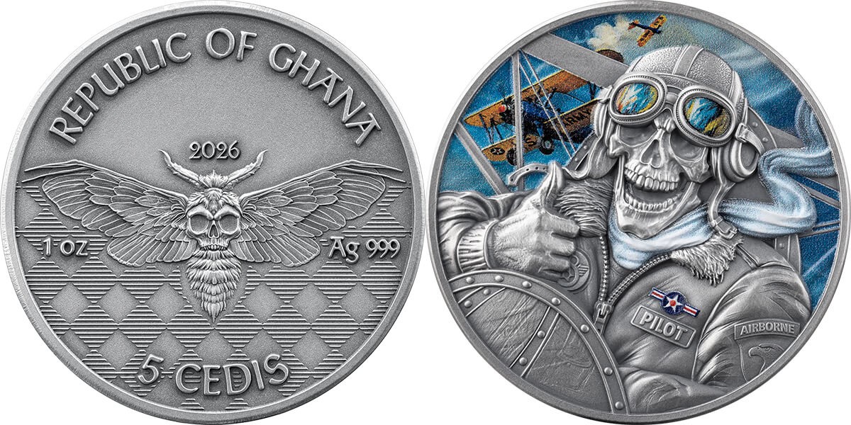 GHANA 5 Cedis 2026 – Momento Mori : Pilot – 1 oz 0.999 silver antique finish (high relief) – mintage 999 pcs – diameter 32 mm – observed price $186.60.
