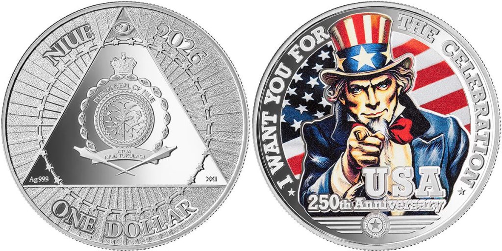 NIUE 1 Dollar 2026 – Uncle Sam – 15.55 g 0.999 silver Proof – mintage 1,000 – diameter 40 mm – observed price $116.60.