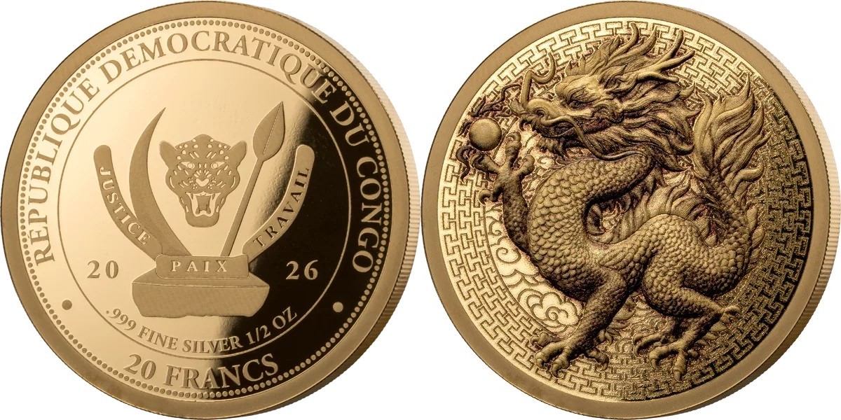 CONGO DEMOCRATIC REPUBLIC 20 Francs 2026 – Dragon – ½ oz 0.999 silver Proof-like (gilded) – mintage 3,000 – diameter 30 mm – unknown price.