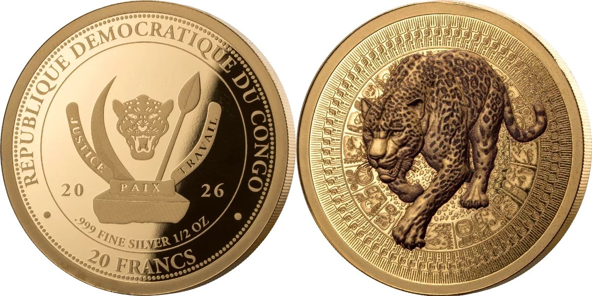 CONGO DEMOCRATIC REPUBLIC 20 Francs 2026 – Jaguar – ½ oz 0.999 silver Proof-like (gilded) – mintage 3,000 – diameter 30 mm – unknown price.