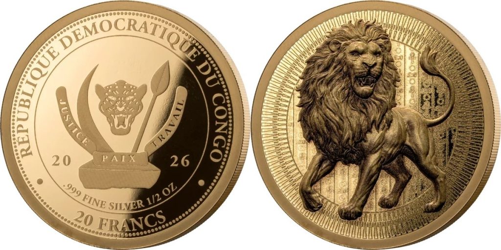 CONGO DEMOCRATIC REPUBLIC 20 Francs 2026 – Lion – ½ oz 0.999 silver Proof-like (gilded) – mintage 3,000 – diameter 30 mm – unknown price.