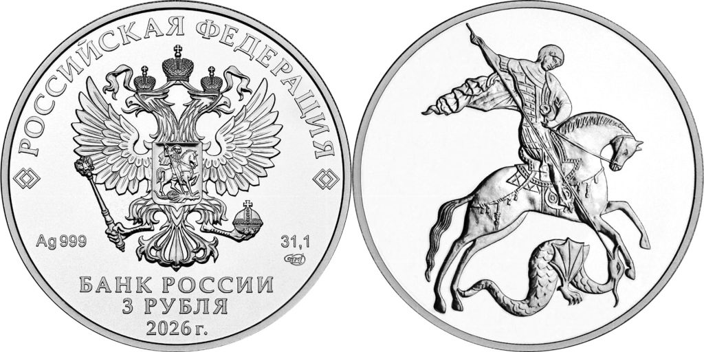 RUSSIA 3 Rubles 2026 – Saint George the Victorious – 1 oz 0.999 silver UNC – mintage 1 million – diameter 39 mm – unknown price.