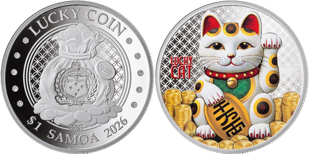 SAMOA 1 Dollar 2026 – Maneki-neko – 15.55 g 0.999 silver Proof – mintage 1,000 – diameter 40 mm – observed price $116.60.