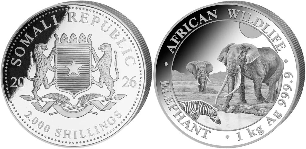 SOMALIA 2000 Shillings 2026 – Elephant – 1 kg 0.999 silver BU – unlimited mintage – diameter 100 mm – unknown price.
