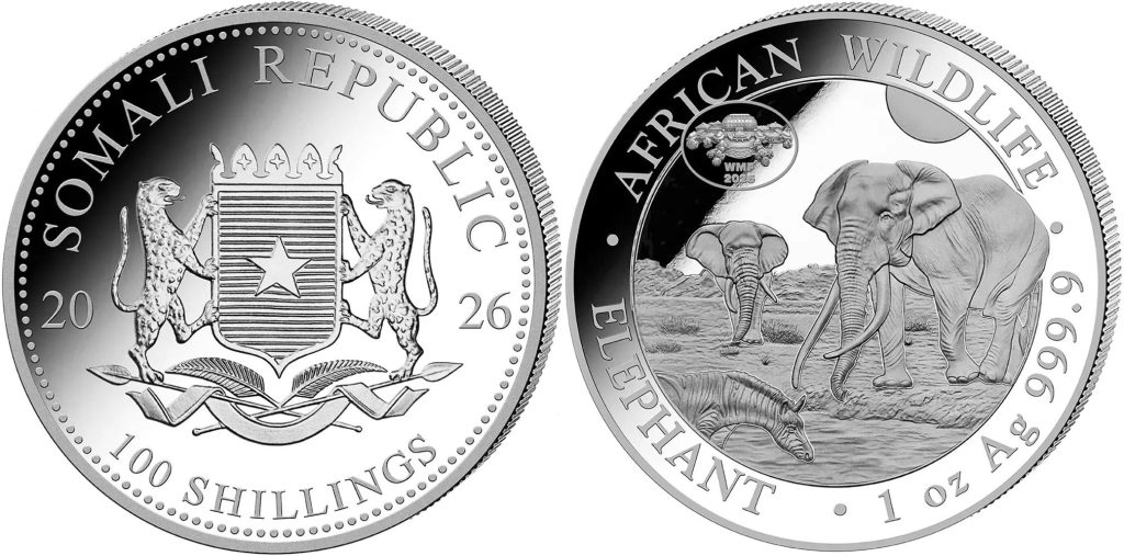 SOMALIA 100 Shillings 2026 – Elephant (privy mark World Money Fair Berlin) – 1 oz 0.999 silver BU – mintage 1,000 – diameter 38.6 mm – unknown price.