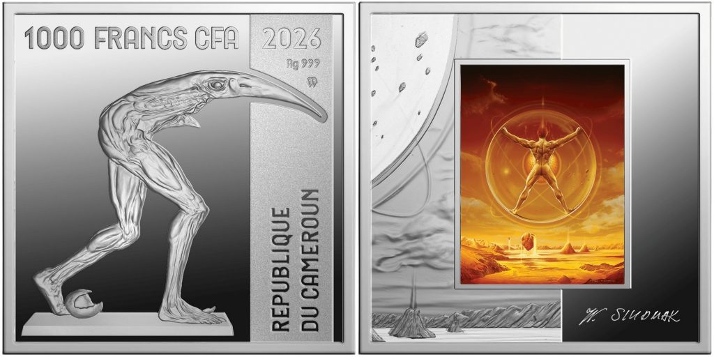 CAMEROON 1000 Francs CFA 2026 – Wojciech Siudmak : Energy – 1 oz 0.999 silver Proof – mintage 1,000 – size 40 x 40 mm – unknown price.