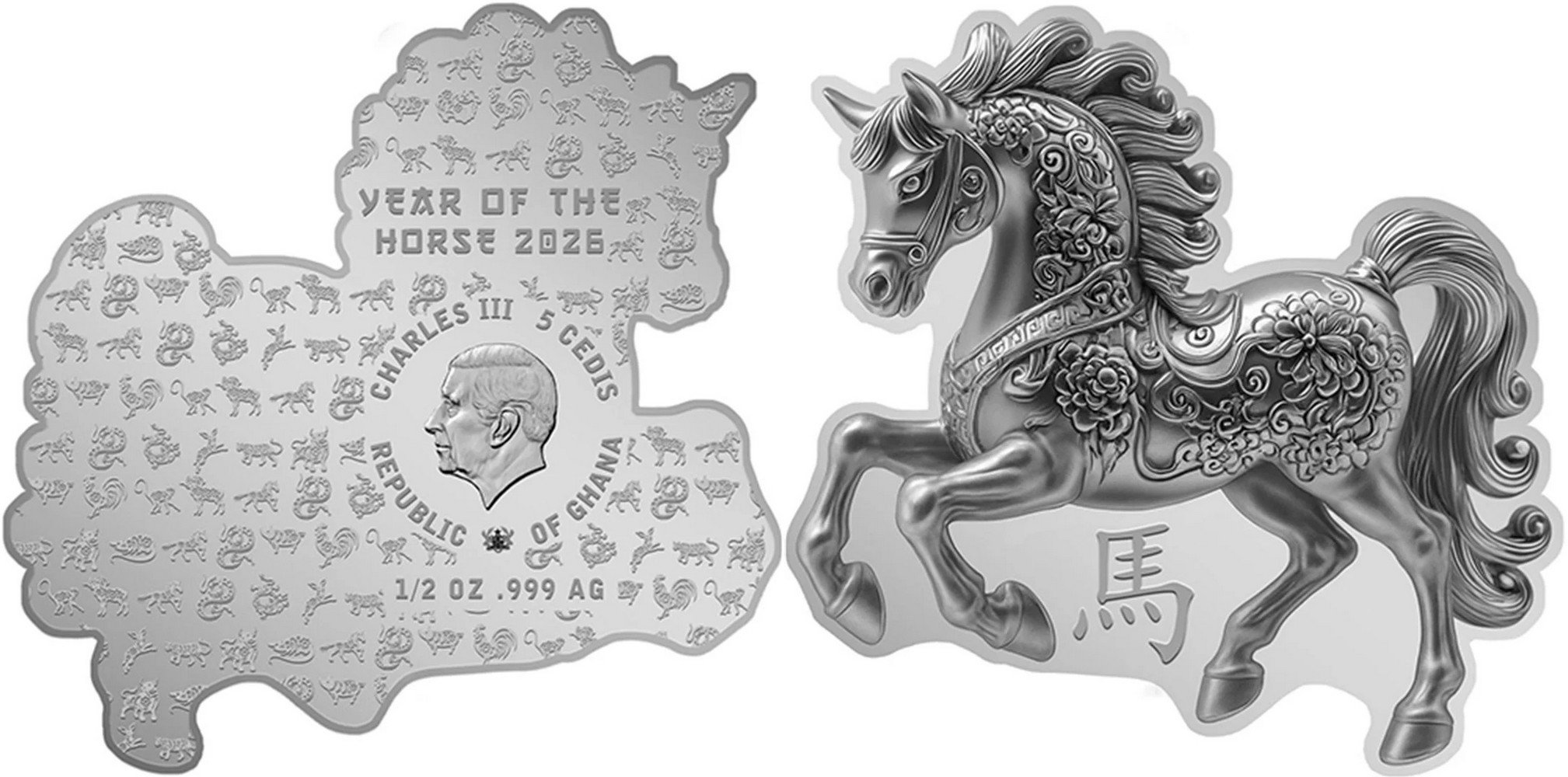 GHANA 5 Cedis 2026 – Year of the Horse – ½ oz 0.999 silver BU – mintage 888 pcs – size 33 x 45 mm – unknown price.