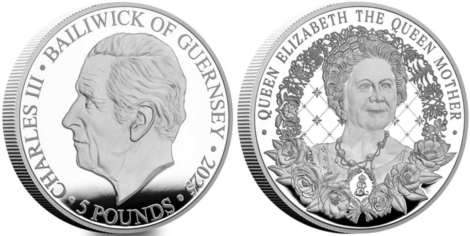 GUERNSEY 5 Pounds 2025 – Elizabeth the Queen Mother – 28.28 g 0.925 silver Proof – mintage 995 pcs – diameter 38.61 mm – unknown price.
