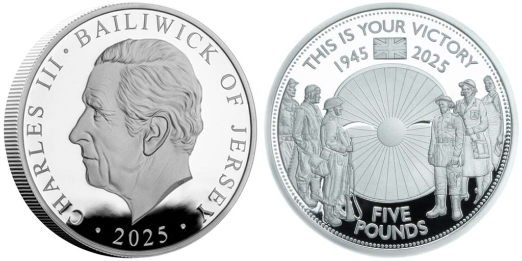 JERSEY 5 Pounds 2025 – 80th Anniversary of the Victory – 28.28 g 0.925 silver Proof – mintage 995 pcs – diameter 38.61 mm – unknown price. 56.56 g piedfort exist.
