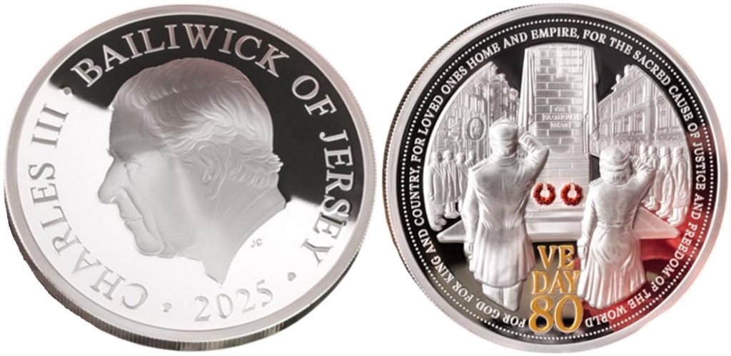JERSEY 10 Pounds 2025 – VE Day 80 years – 5 oz 0.999 silver Proof – mintage 350 pcs only – diameter 65 mm – unknown price.