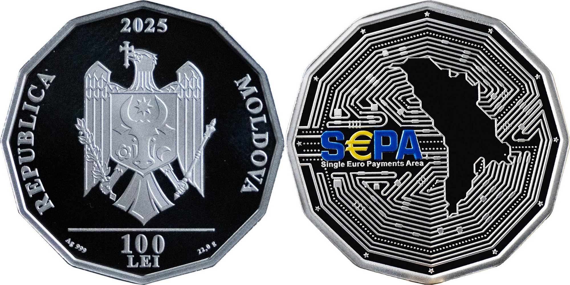 MOLDOVA 100 Lei 2025 – Moldova in the Single Euro Payments Area – 22 g 0.999 silver Proof – mintage 2,500 – diameter 35 mm – unknown price.