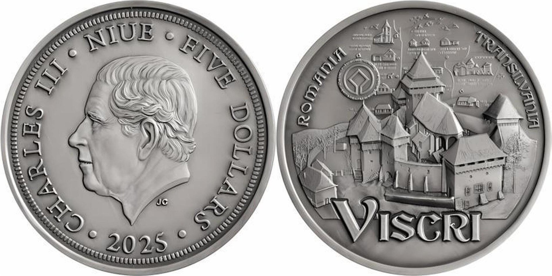 NIUE 5 Dollars 2025 – Viscri – 2 oz 0.999 silver BU – mintage 2,000 – diameter 50 mm – unknown price.