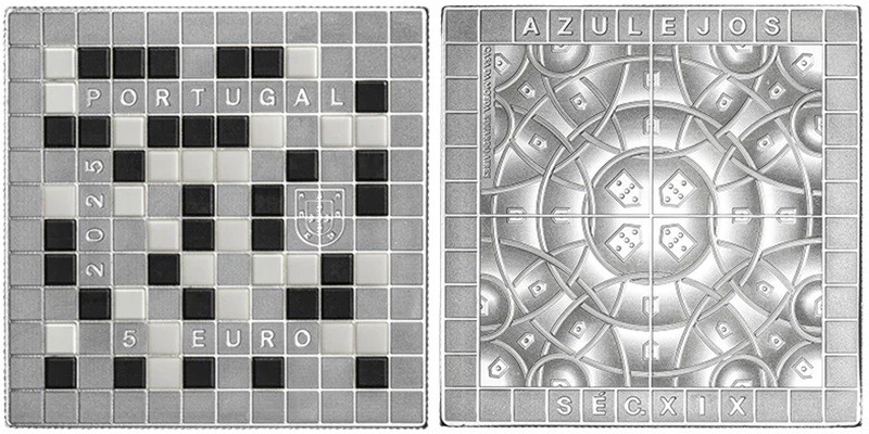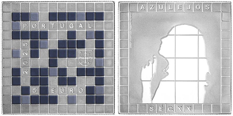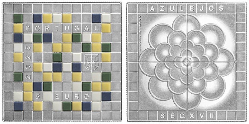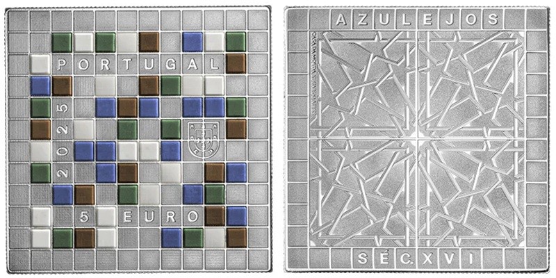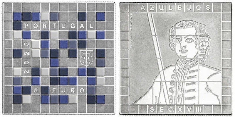 PORTUGAL 5 Euro 2025 – Portuguese tiles 18th century – 14 g 0.999 silver Proof (with ceramic elements) – mintage 3,000 – diameter 30 mm – unknown price.