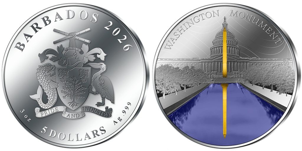 BARBADOS 5 Dollars 2026 – Washington Monument – 3 oz 0.999 silver Proof – mintage 999 pcs – diameter 55 mm – unknown price.