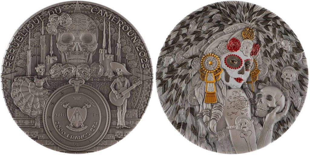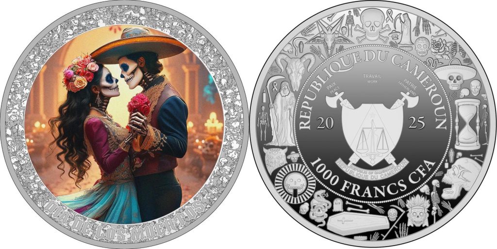 CAMEROON 1000 Francs CFA 2025 – Dia de los muertos : Dancing Couple – 1 oz 0.999 silver Proof – mintage 149 pcs only – diameter 40 mm – observed price $128.70.