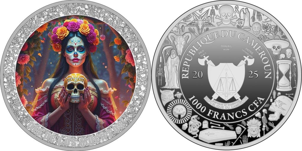CAMEROON 1000 Francs CFA 2025 – Dia de los muertos : Woman with Skull – 1 oz 0.999 silver Proof – mintage 149 pcs only – diameter 40 mm – observed price $128.70.