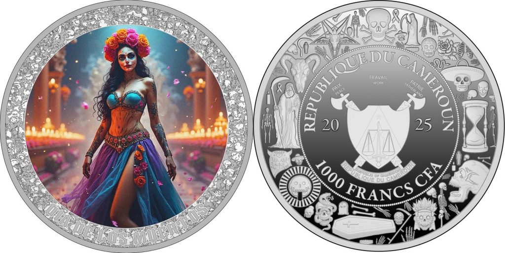 CAMEROON 1000 Francs CFA 2025 – Dia de los muertos : Dancing Queen – 1 oz 0.999 silver Proof – mintage 149 pcs only – diameter 40 mm – observed price $128.70.