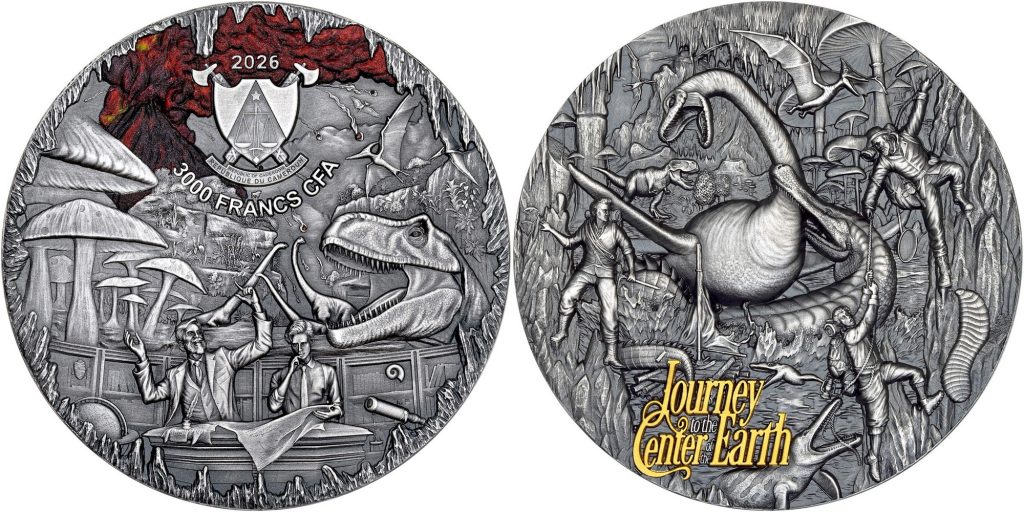 CAMEROON 3000 Francs CFA 2026 – Journey to the Center of the Earth – 3 oz 0.999 silver antique finish – mintage 250 pcs only – diameter 60 mm – unknown price.