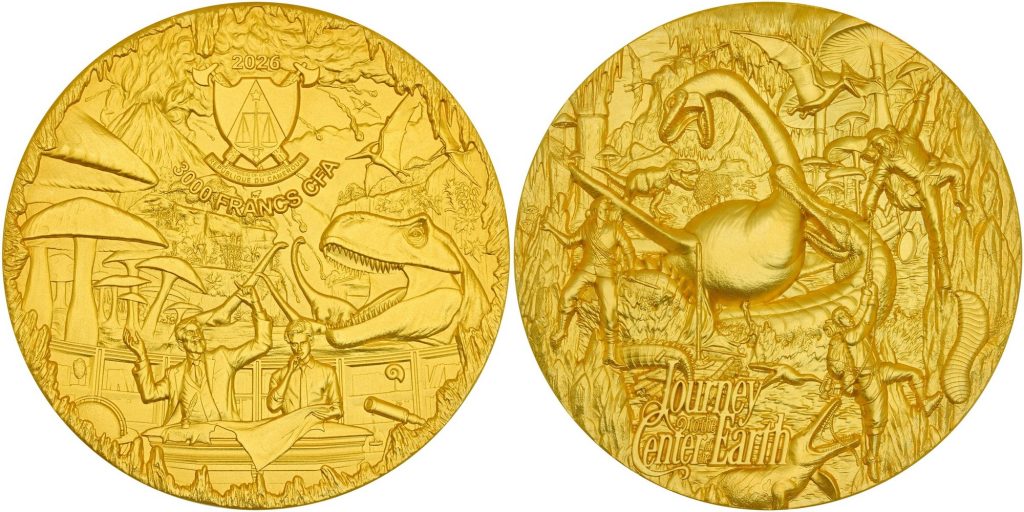 CAMEROON 3000 Francs CFA 2026 – Journey to the Center of the Earth – 3 oz 0.999 silver antique finish (gilded) – mintage 99 pcs only – diameter 60 mm – unknown price.