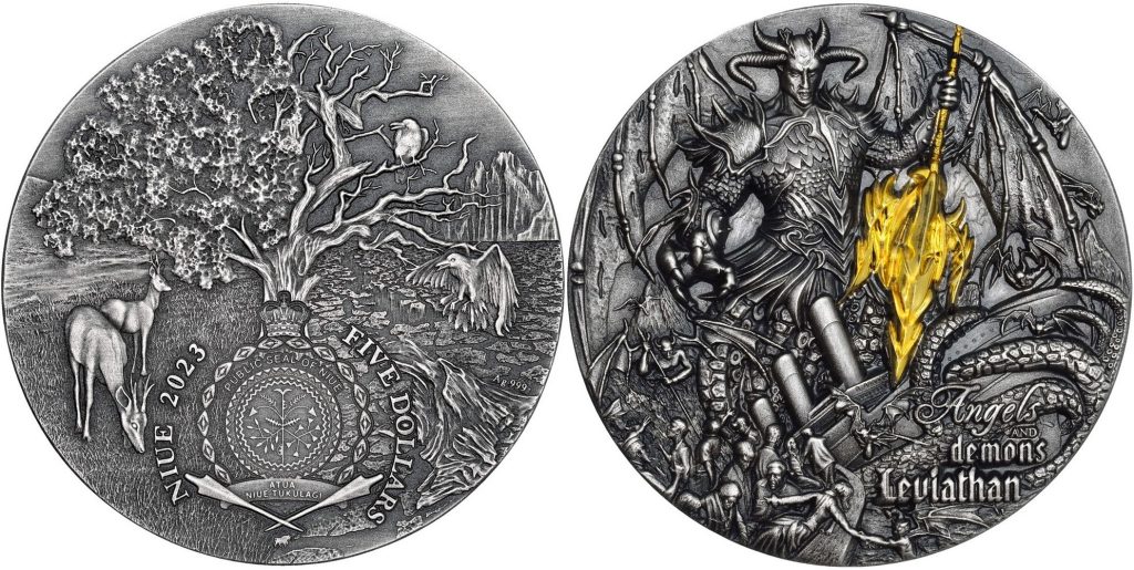 NIUE 5 Dollars 2023 – Angels and Demons : Leviathan – 2 oz 0.999 silver antique finish (high relief) – mintage 250 pcs only – diameter 45 mm – observed price $349.60.