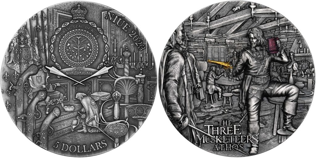 NIUE 5 Dollars 2023 – Les trois mousquetaires : Athos – 62,2 g Argent 999 finition antique (haut relief) – 250 exemplaires seulement – diamètre 45 mm – prix observé 292,40 euros.