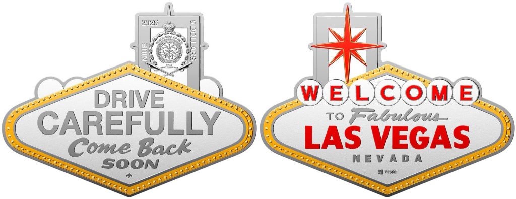 NIUE 5 Dollars 2026 – Welcome to Fabulous Las Vegas – 2 oz 0.999 silver Proof – mintage 777 pcs – size 70 x 54 mm – unknown price.