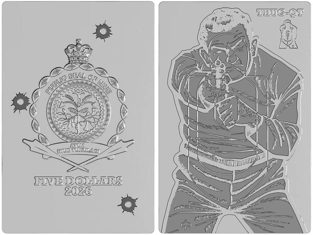 NIUE 5 Dollars 2026 – THUG QT – 2 oz 0.999 silver Proof – mintage 500 pcs only – size 46 x 70 mm – unknown price.