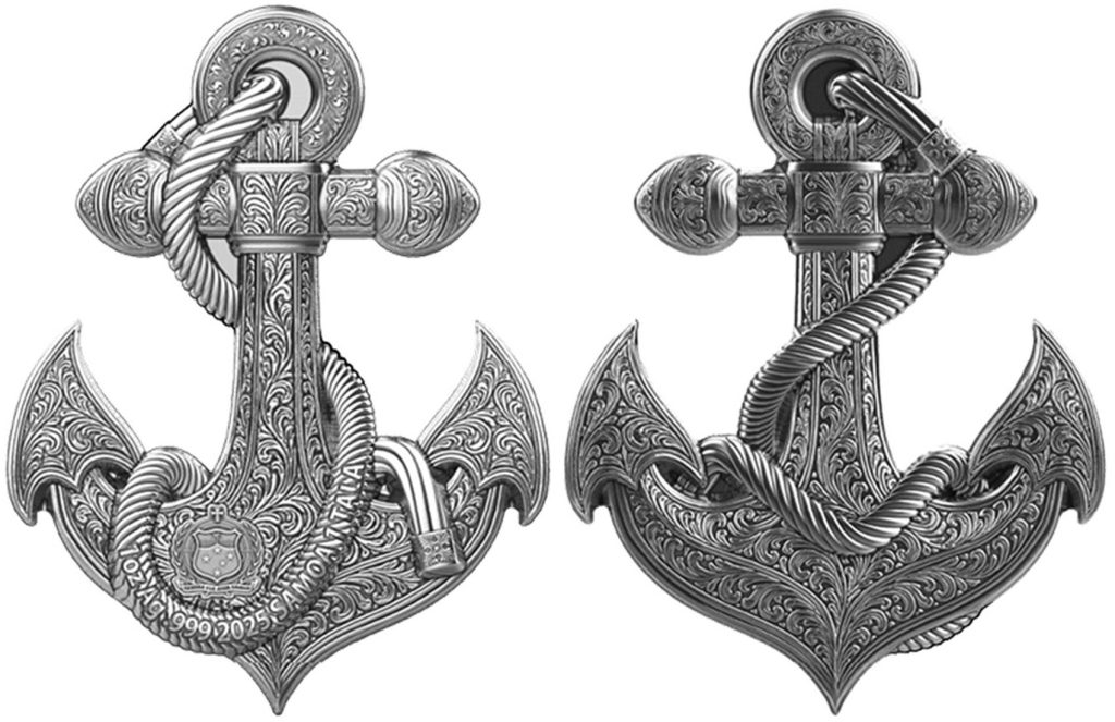SAMOA 1 Tala 2025 – Nautical Anchor – 1 oz 0.999 silver antique finish – mintage 1,000 – size 32 x 42 mm – unknown price.